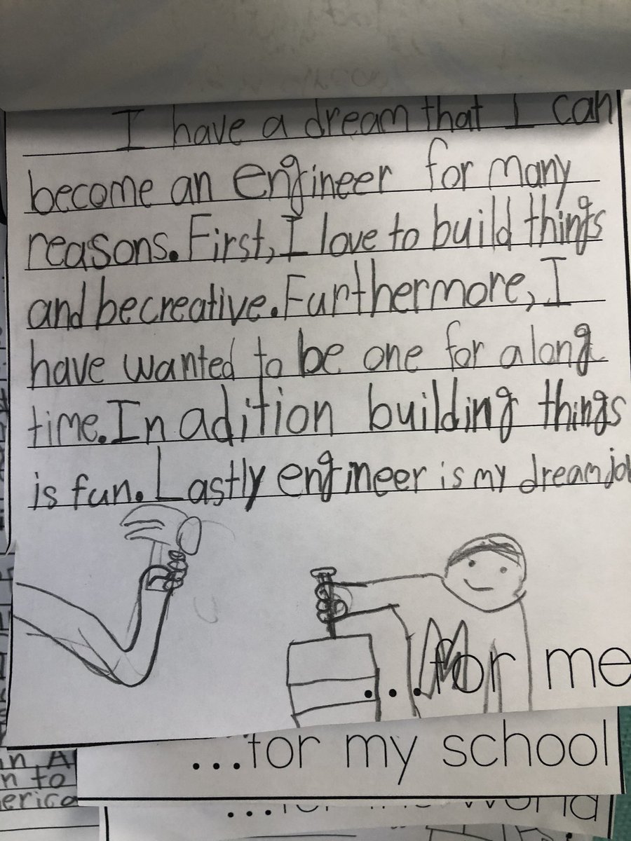 Last week, 5th graders shared their “I Have a Dream” books with partners. I’m amazed at their dreams for themselves, their school, and the world.