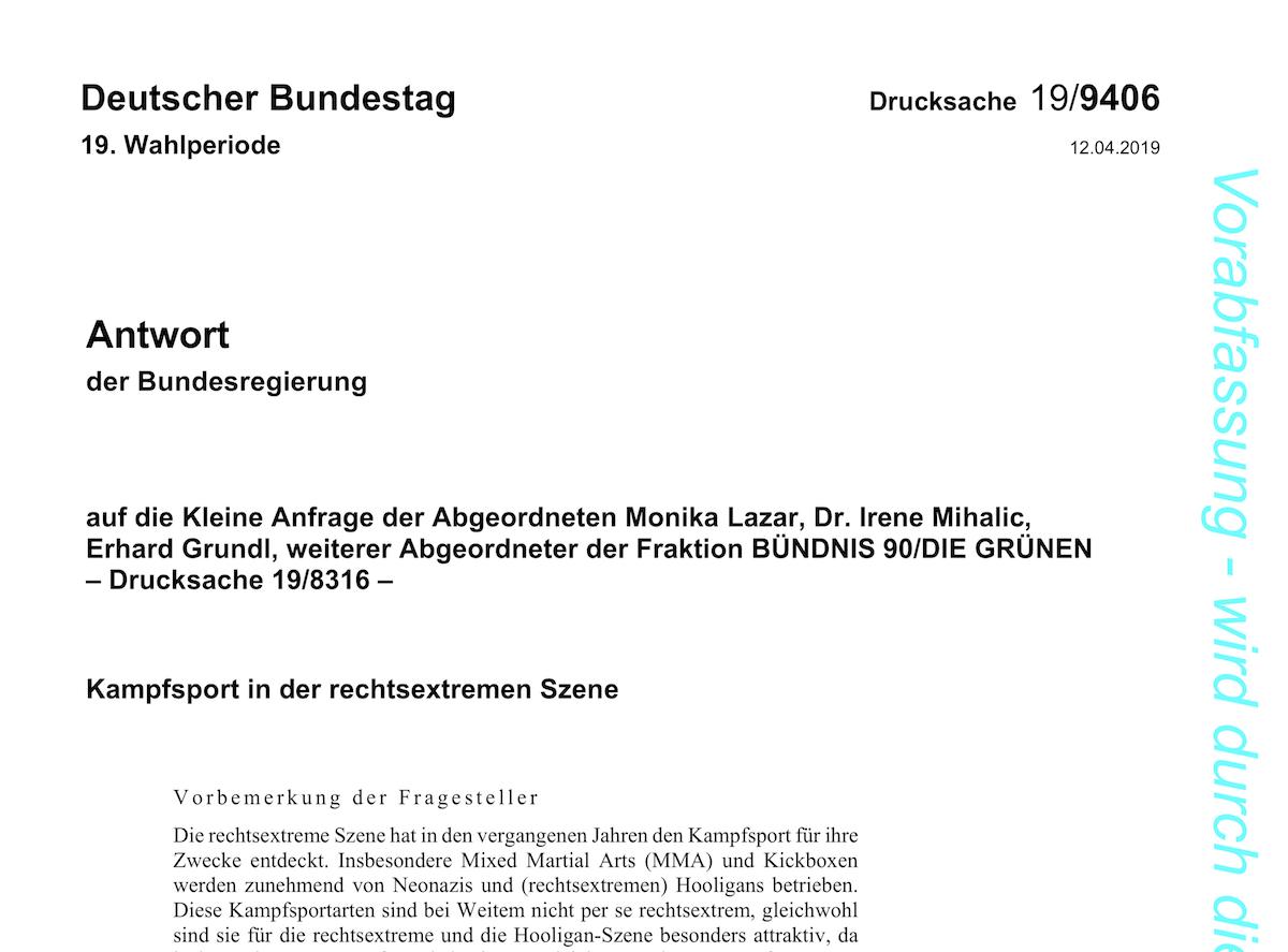 #Rechtsextremisten im Kampfsport für Auseinandersetzungen auf der Straße mit dem politischen Gegner oder der Polizei genutzt wird." Zitat aus der heute veröffentlichten DS 19/9406 https://bit.ly/2KXZvY1#Hooligans#MMA pic.twitter.com/0Mt6YJVDec