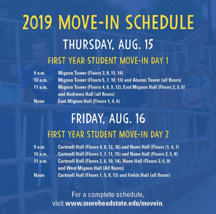 It all begins tomorrow!!!! First Year Student Move In Day 1, 2019 commences at 9AM. Mignon Tower Alumni Tower East Mignon Andrews Hall Morehead Residents be advised, allow more time to get to your destinations and be patient with traffic in town!