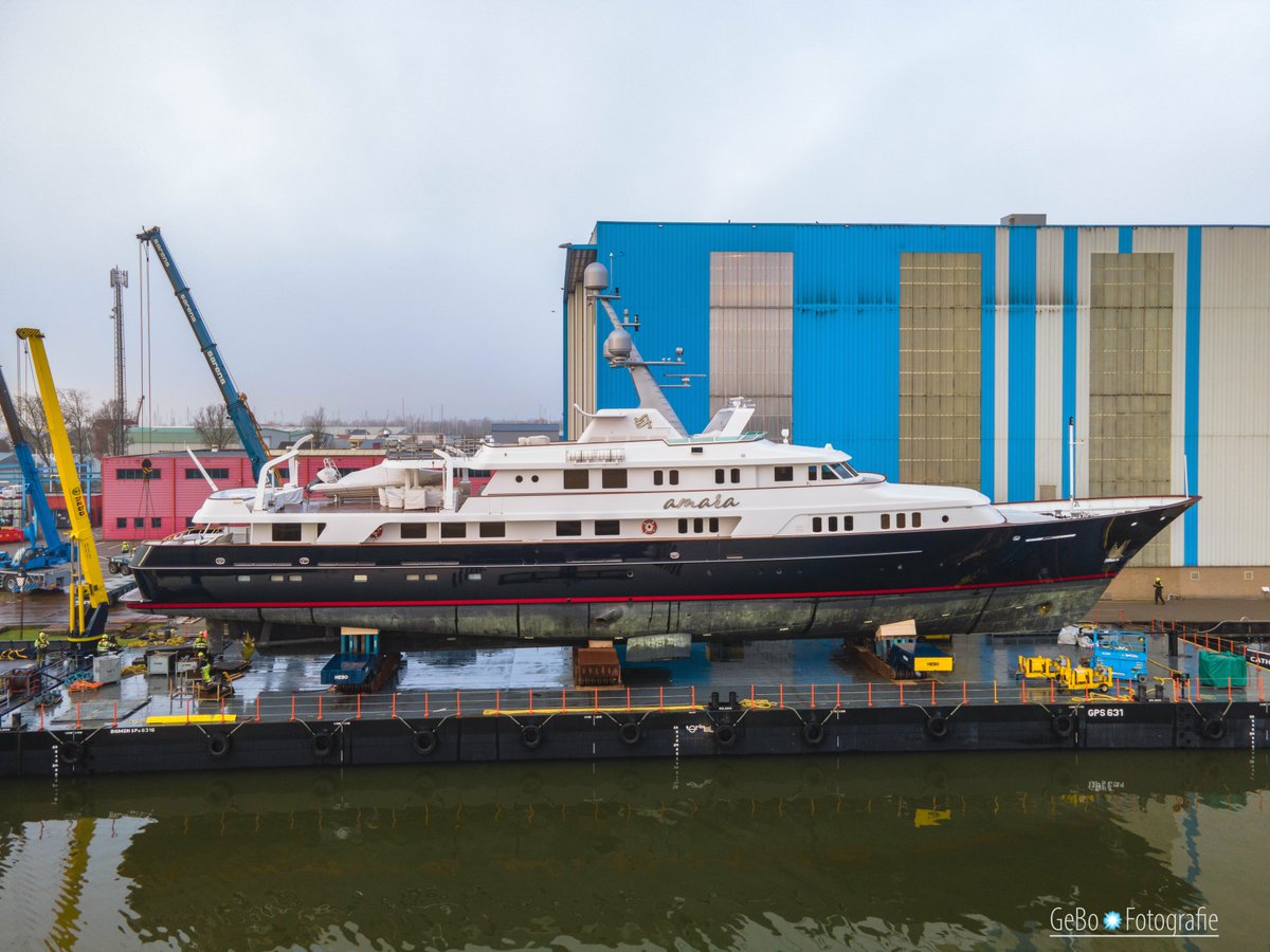 #Amara, which left#Amsterdam for#Makkum yesterday morning, was unloaded at#Feadship’s#shipyard today. The 57.3m/ 188ft#yacht is facing a major refit. Photos by GeBo Fotografie.pic.twitter.com/4RPoXd9Wta