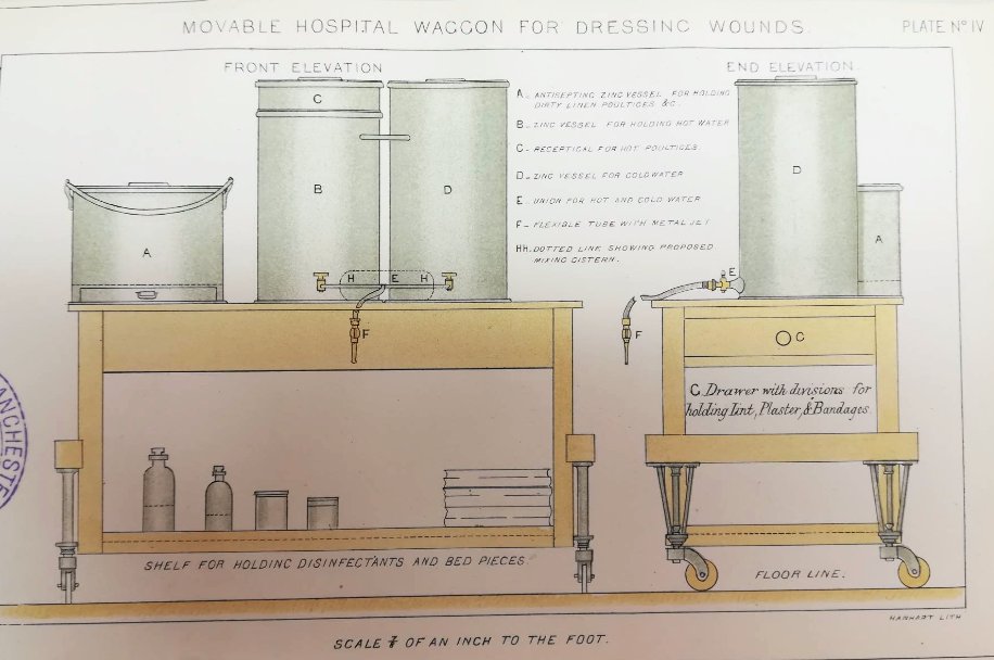 : hospital innovations from 1872. Bedside lockers and a "moveable waggon for dressing wounds"