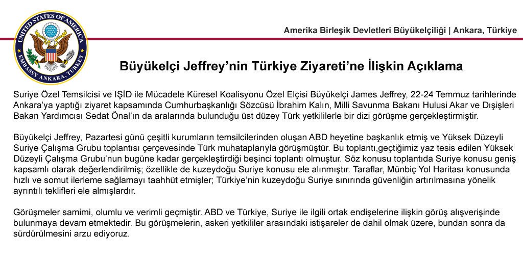 Turkish Presidential Spoxperson Mr. Kalın met with the U.S. Special Envoy to Syria Mr. James Jeffrey at Turkish Presidential Complex in capital Ankara. The duo discussed East of the Euphrates;