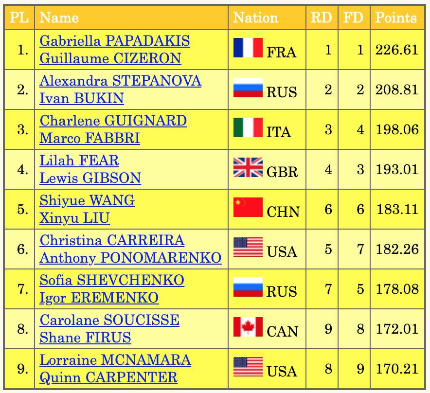 #GabriellaPapadakis /#GuillaumeCizeron (FRA) 222.24#MadisonChock /#EvanBates (USA) 204.84#CharleneGuignard /#MarcoFabbri (ITA) 203.34#IDF#IDF2019pic.twitter.com/s9pbVOoDTX