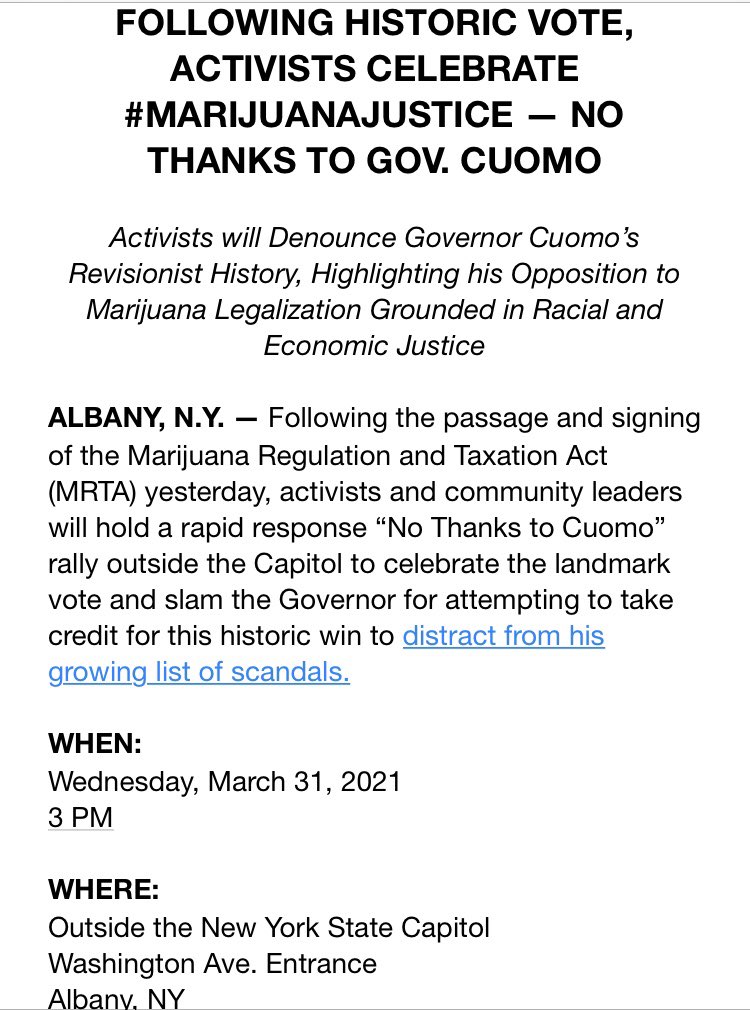 JOIN US: @ 3pm Outside the Capitol to Celebrate Historic Vote to Marijuana Legalization Grounded in Racial and Economic Justice & Denounce Governor Cuomo’s Revisionist History!!