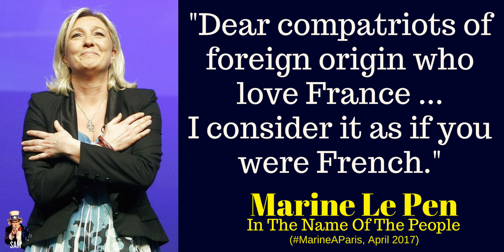 Marine Le Pen: "Dear compatriots of foreign origin who love France... I consider it as if you were French." WE LOVE YOU TOO!