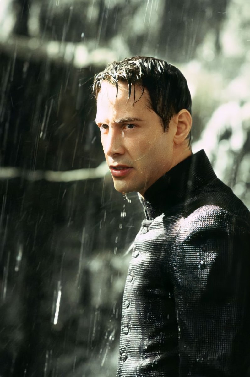 Keanu keeping it serious behind the scenes of a Matrix Reloaded promo shooting or better said, he tried to