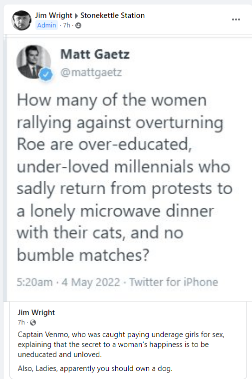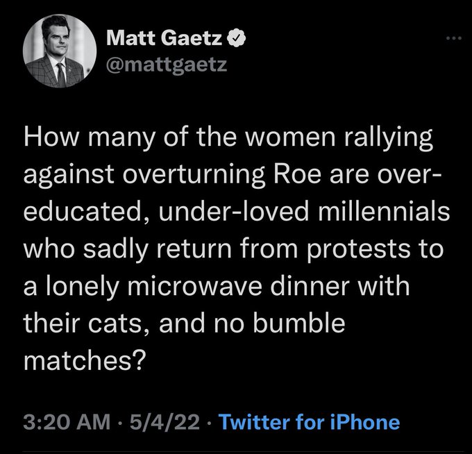 Matt Gaetz wants to know how many women rallying against overturning Roe are over-educated. Thats ridiculous misogyny. More importantly, how many under age girls were forced to have abortions by Matty & were paid for using venmo?