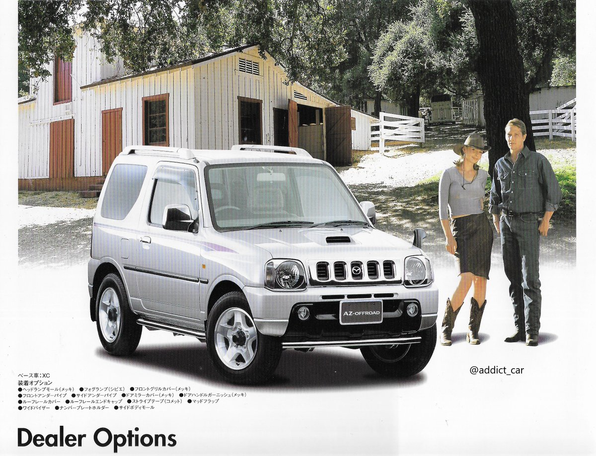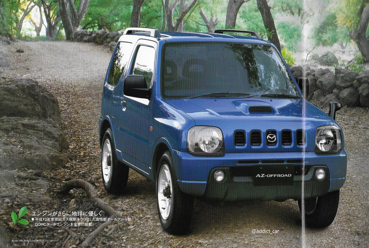 Mazda and Suzuki have a history of co-operation and badge engineering, and that was behind the Japan-only Mazda AZ-Offroad, a rebadged third-generation 4WD Suzuki Jimny seen in this 2000 brochure. It had a 660cc turbo engine and automatic transmission.