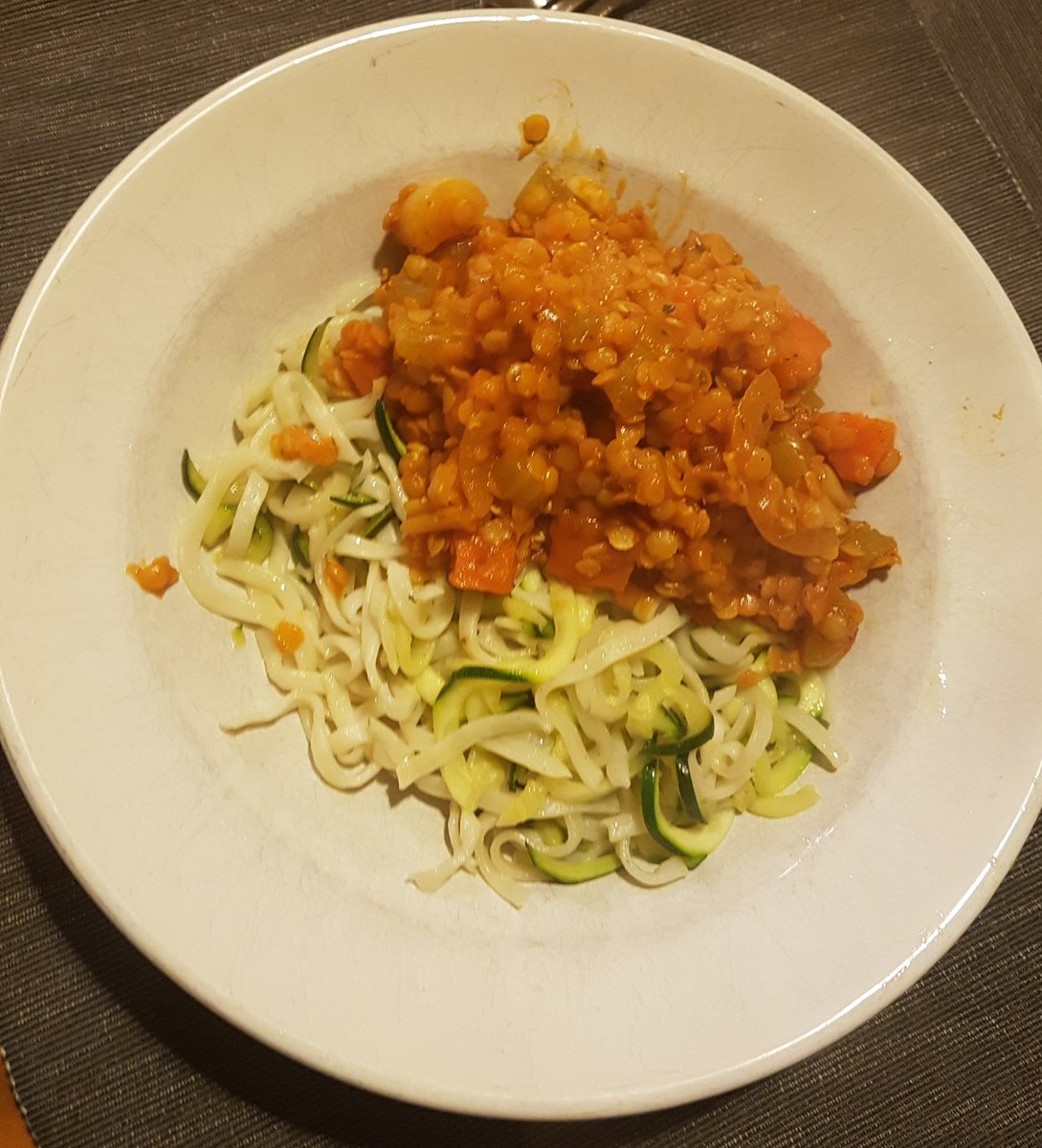 Lentil Ragu on a bed of courgette and noodles.