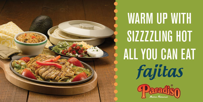 Treat yourself to your favorite sizzling fajitas for all you can eat steak, chicken, pork carnitas, and meatless fajitas all day on Wednesdays!