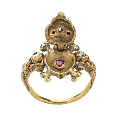 This gold memento mori ring has a skull and crossbones -shaped bezel which opens to reveal a ruby. The eye sockets, nose and tips of the crossed bones are decorated with diamonds. Some white enamel clings to the skull. 17th cent (