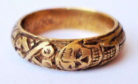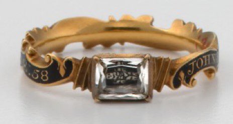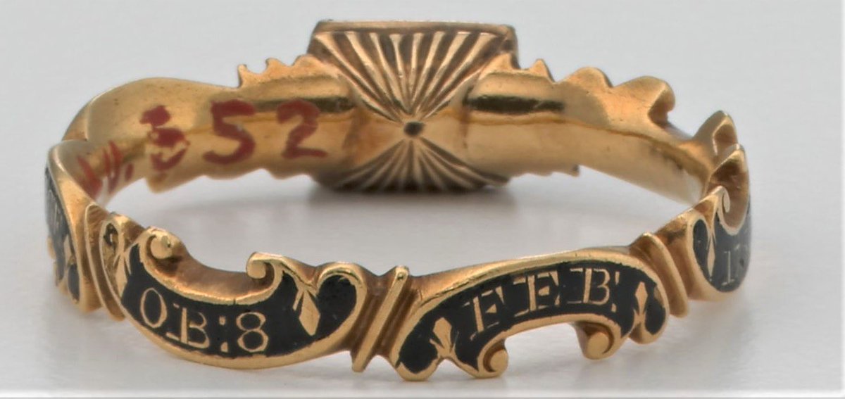 Gold mourning ring with a tiny skeleton resting inside the rectangular bezel. The hoop is made up of a series of enamelled scrolls that give the name of the deceased and the date of his death - John Bragge, 8 Feb 1755. (