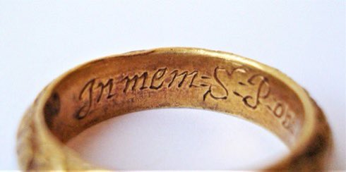 The enamel may be lost from this mourning ring but the skeleton’s grin remains. Crossed bones can be seen above the skeleton’s head too. Inscribed for S.P. who died 4th Nov (16)85 aged 21. (