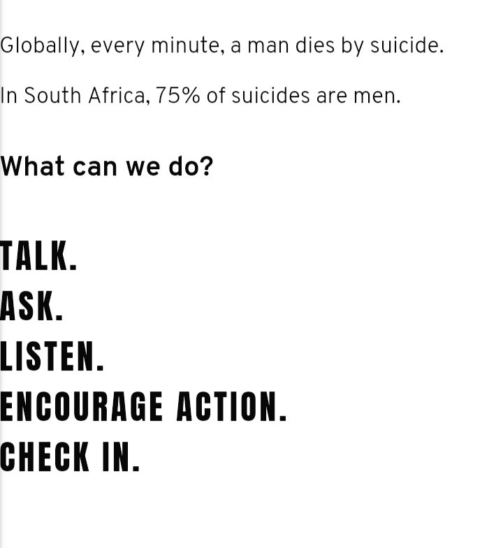 Suicide is the biggest cause of death in men under 45 in this country. 88 men a week take their own lives, mainly due to male stereotypes. Always remember, it’s ok to talk.