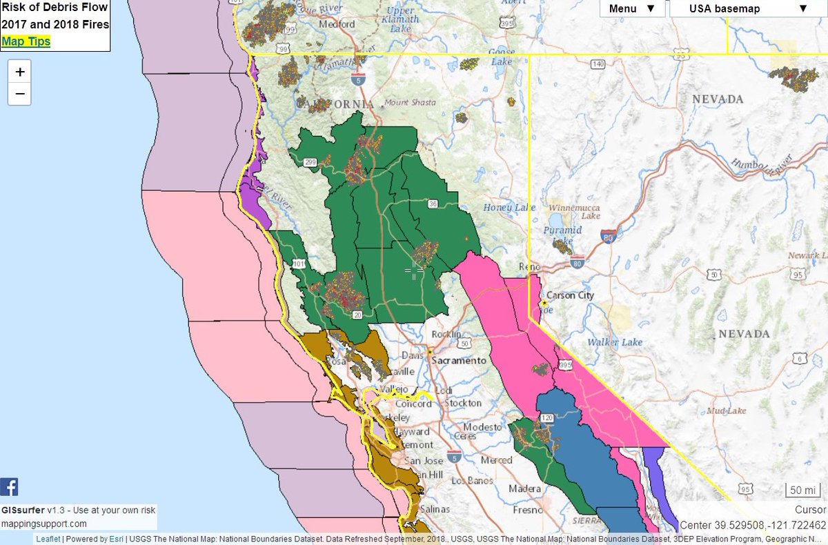 Interactive map showing risk of debris flow from 2017 and 2018 fires. Lots of data layers you can turn on/off/restack. For help click “Map tips” upper left corner. Open