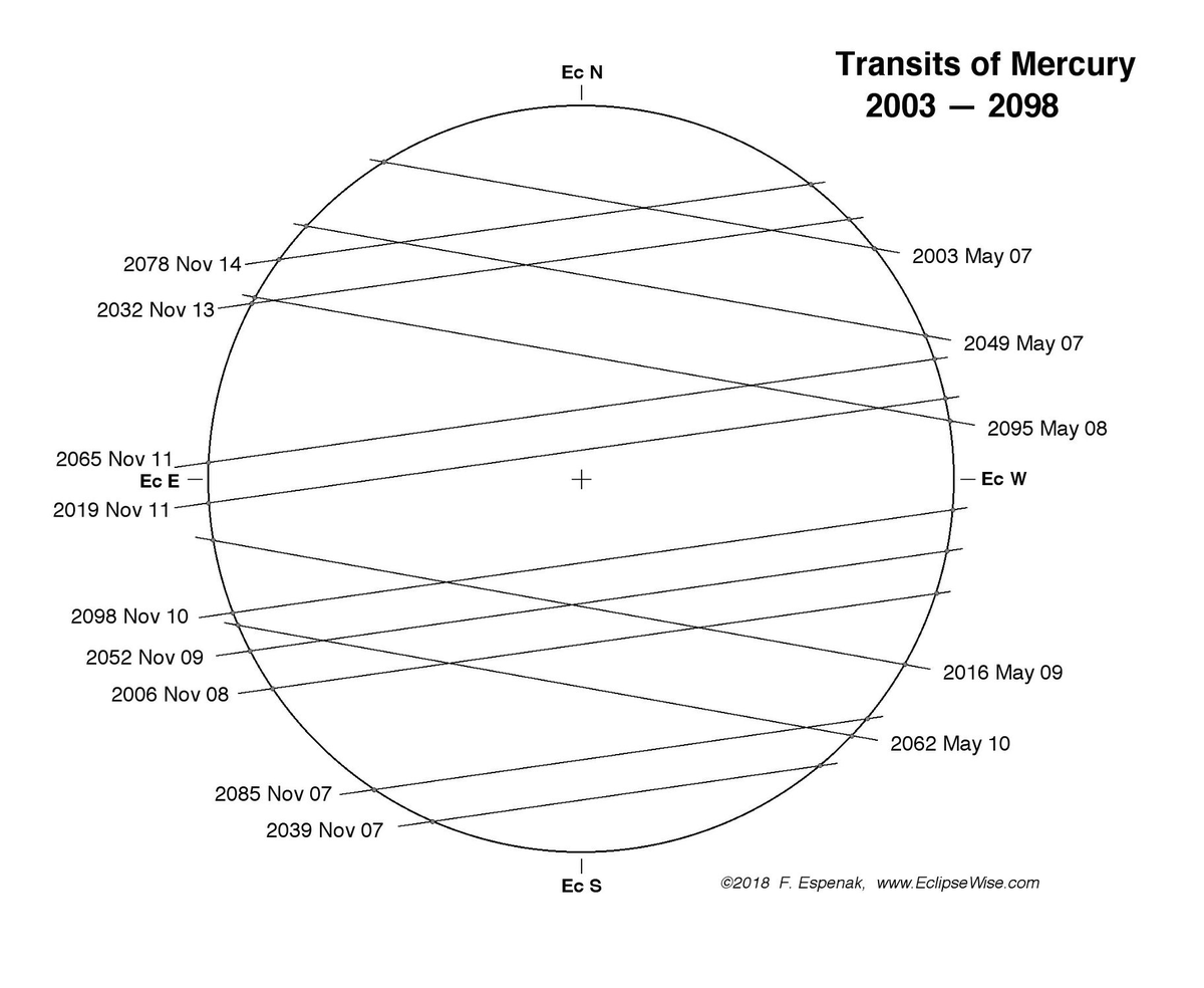 #MercuryTransit Mercury's nodes are in Scorpio (November) and Taurus (May). For a transit to occur, like an eclipse, the Sun and Mercury are conjunct in longitude, parallel in declination and at the same latitude. Diagram Fred Espenak. pic.twitter.com/LqWPlSqlv4