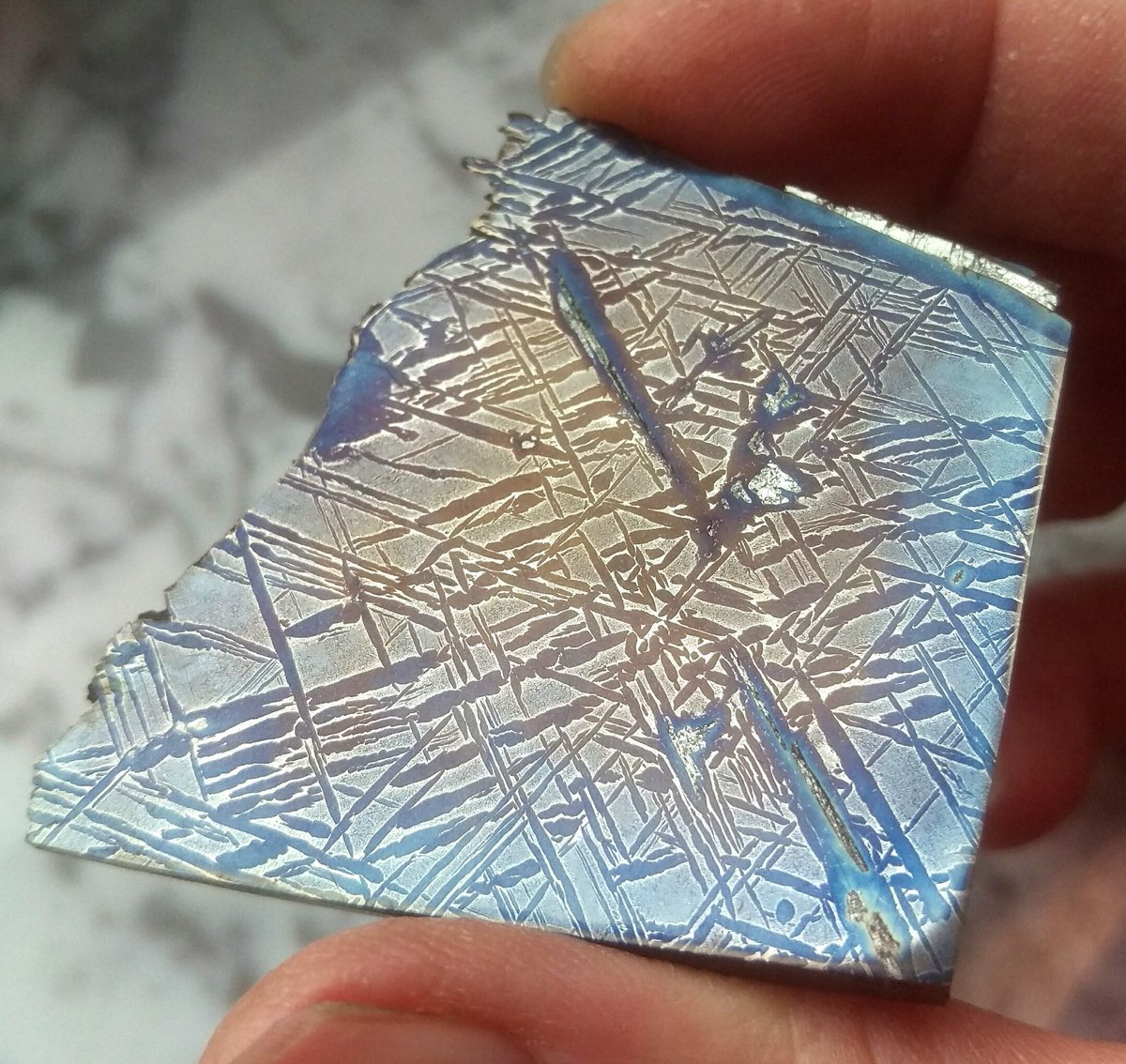 Saint Aubin nickel-iron meteorite slice that I polished and tint etched. Turned out gorgeous and well worth the effort!