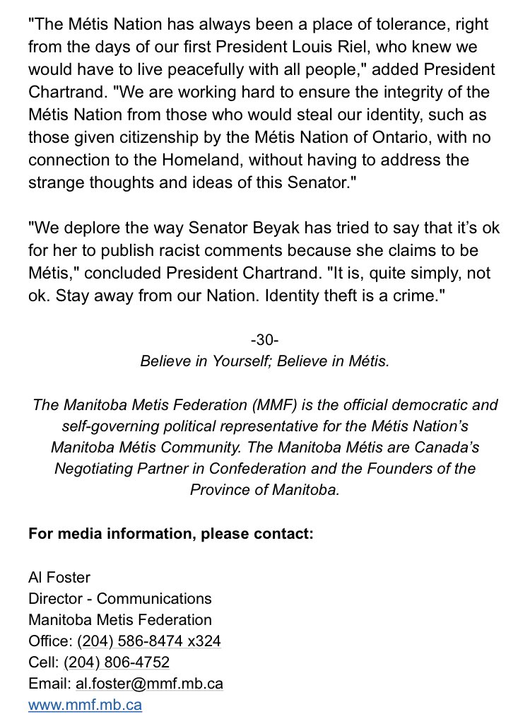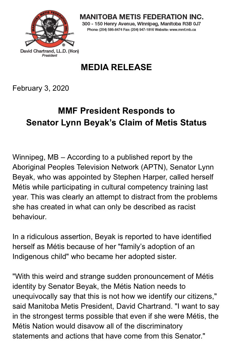 @MBMetis_MMF re@APTNNews article reporting claims of Senator Lynn Beyak to be#Metis. pic.twitter.com/R78pXNS72o