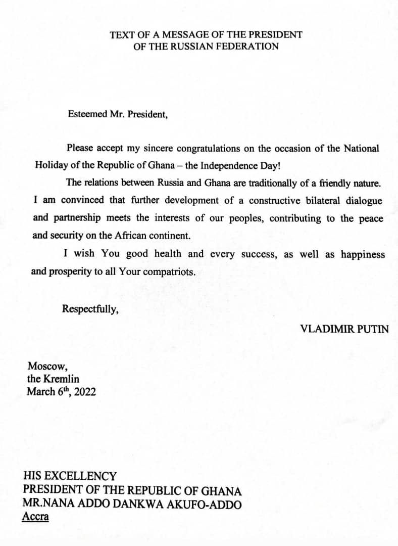 President of Russia, Vladimir Putin congratulates Ghana on 65th Independence Day anniversary