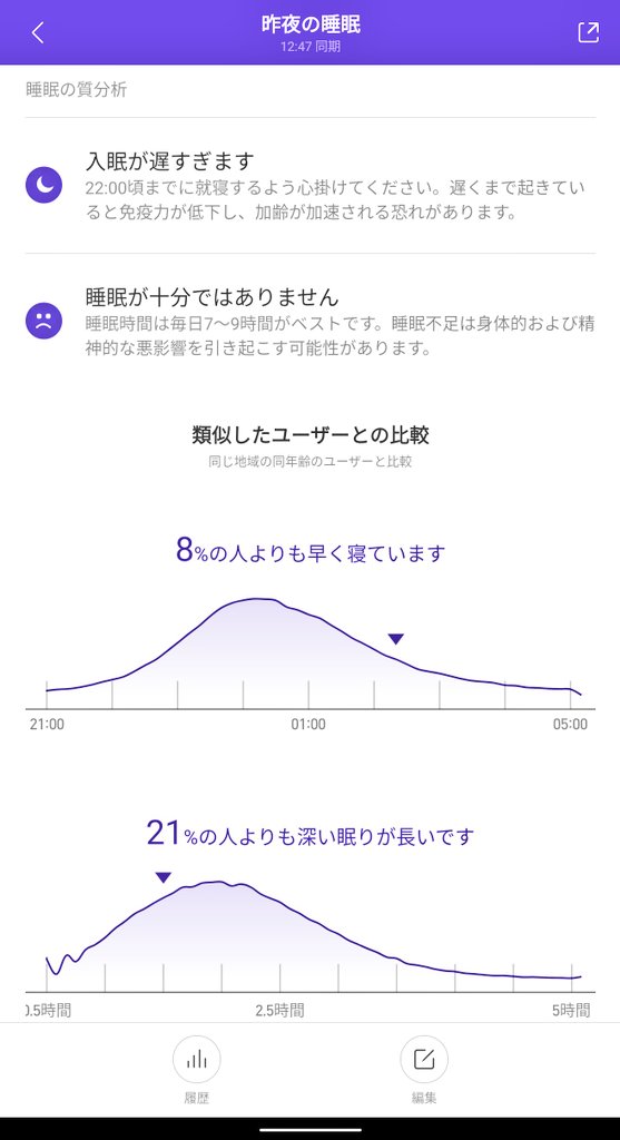 昨日の睡眠スコア 浅い眠りが多いみたいだけど、これがいいのか悪いのかは分からない笑