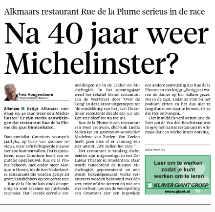 Helaas geen Michelin-ster voor team Rue de la Plume van @luellamolenaar en@Maadvanzoelen als bekroning op jullie werk. Wat jullie doen is sowieso heel goed (ook vd aantrekkelijkheid van onze regio Alkmaar)