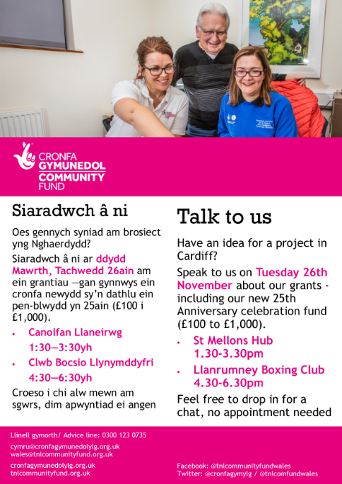 @TNLComFundWales are doing a drop in in East Cardiff in a couple of weeks.The aim is to promote the new#microgrant (up to £1,000) to smaller unincorporated groups. One of our Development Officers will also be available to give advice. No appointment needed, just drop in! pic.twitter.com/KEwuGZtB85