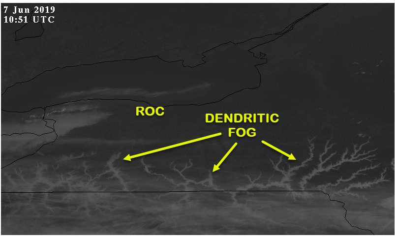 Not uncommon this time of year is early morning dendritic fog that fills the river valleys to the south of