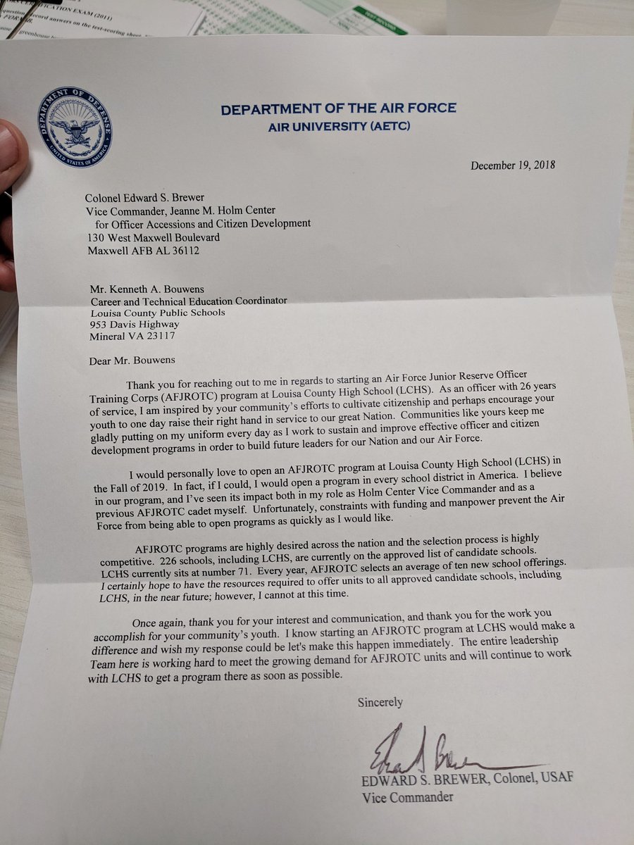 @realDonaldTrump sad to see another rejection letter in our efforts to start a JROTC. Can you help us? Support our#Military. pic.twitter.com/rNlAJ8g5RI