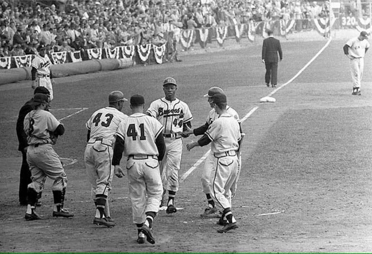 “Old Fays”Teammates welcome Hank Aaron after his HR in the 1957 Braves-Yankees World Series in Milwaukee.