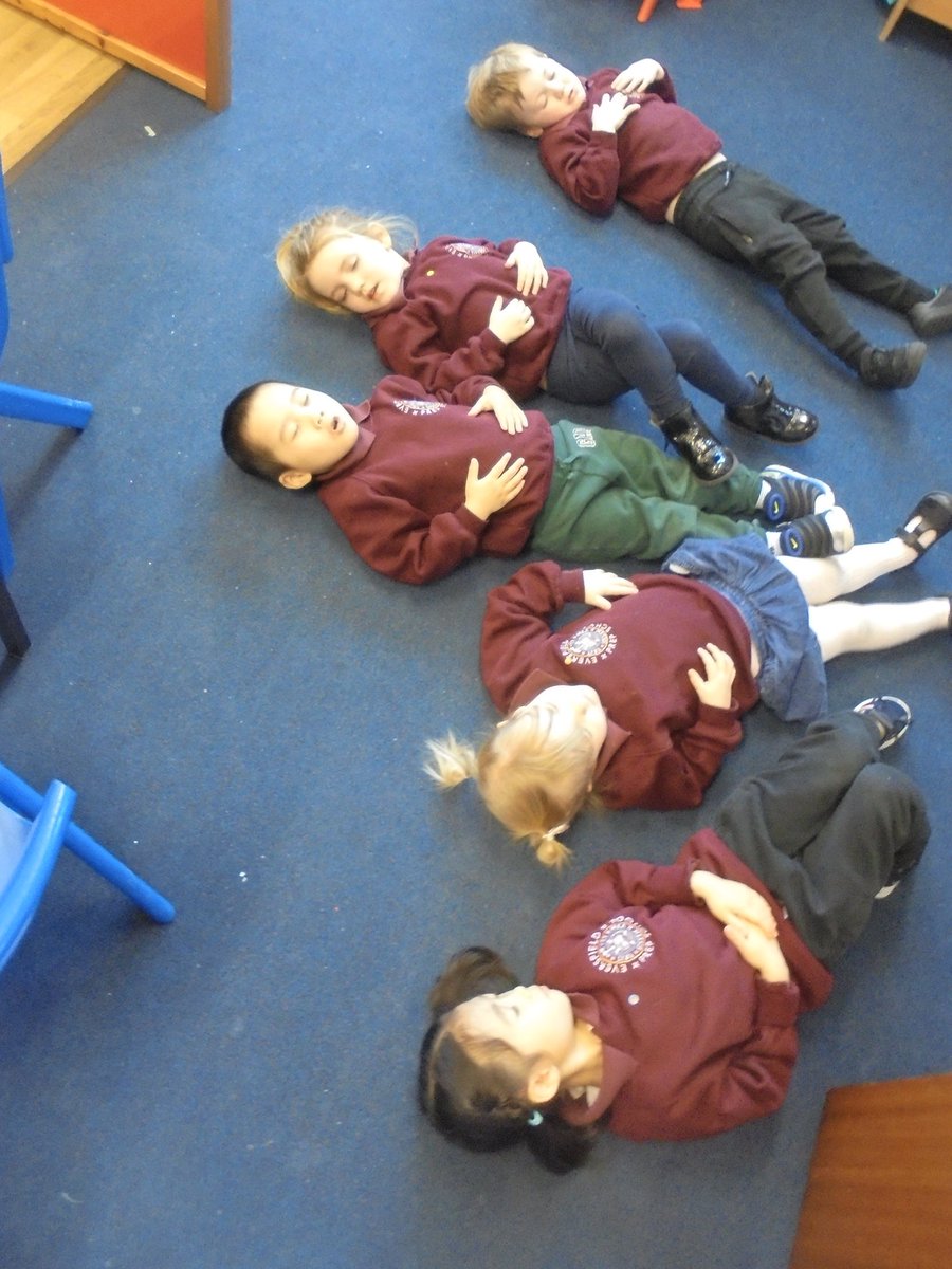 Mrs Maher asked the Kindergarten children to put their hands on their tummies, breathe in & out and think of their favourite things