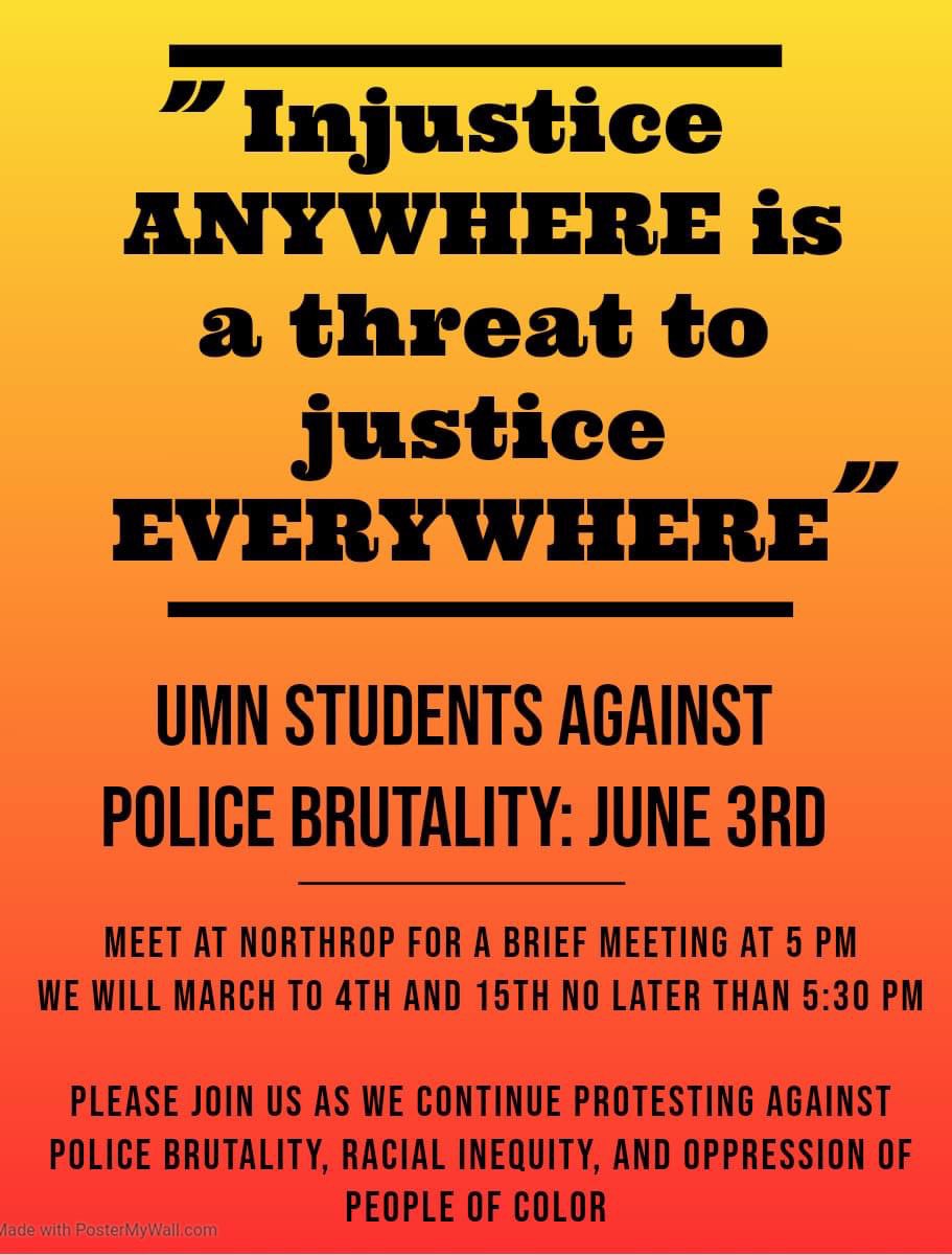 Meet at Northrop today at 5 to join others on our campus in marching against police brutality.