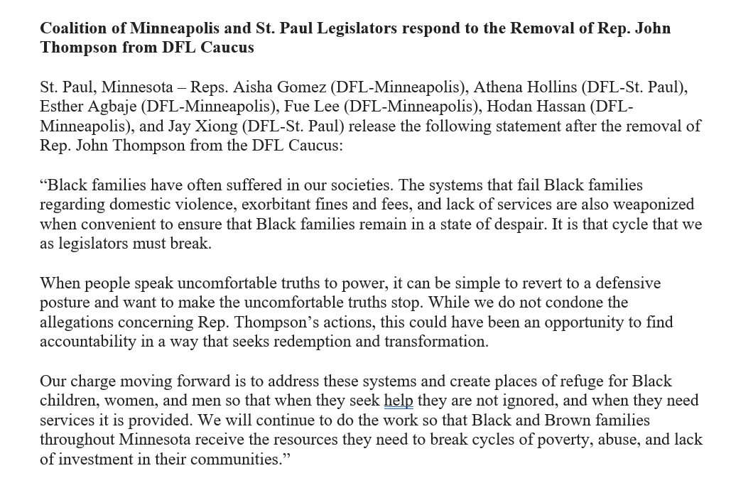 #mnleg representatives following removal of Rep. John Thompson from the DFL caucus pic.twitter.com/XxFfqVitCg