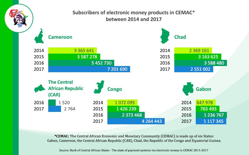 #MobileMoney has followed the same upward trend over the past four years; Cameroon leading with more than 7 million subscribers at the end of 2017 far ahead of Congo that took the 2nd position over Chad. Any idea of What goes wrong in Ndjamena in 2017?