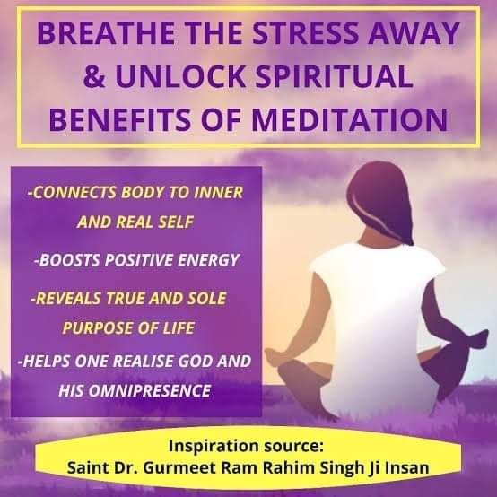 Regular practice of Meditation brings Lasting Stress Relief Benefits. Prioritize your Mental Health and Focus on Meditation to Stay Calm and Energized. Gratitude to spiritual Guru Saint Gurmeet Ram Rahim Singh Ji for this happiness mantra.