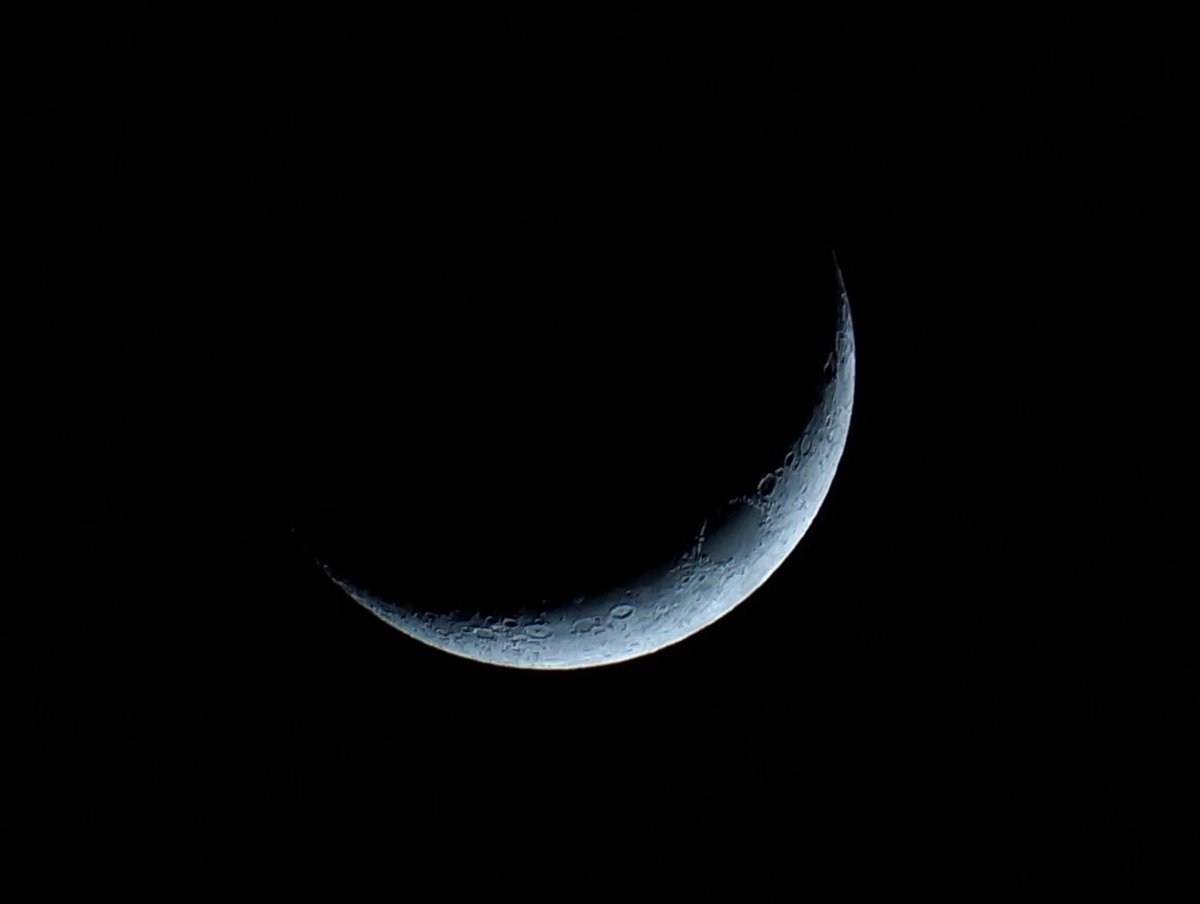 Today's Moon in a clear blue sky. Mono camera. Noisy struggle with a gusty wind blowing everything about. 25% illuminated at 16:30.