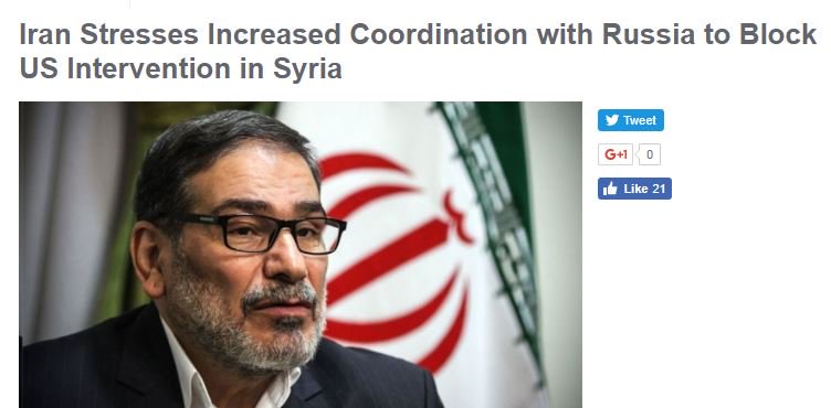 #Iran Security chief Ali Shamkhani says#Tehran and#Moscow must coordinate more to stop US intervention in#Syria. http://en.farsnews.com/newstext.aspx?nn=13960413000759 …pic.twitter.com/4KQpsQjeLh