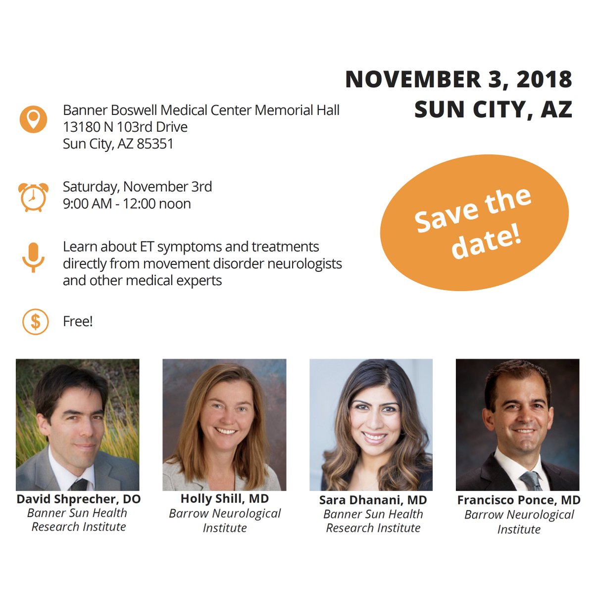 #MovementDisorder experts will be discussing essential tremor symptoms and treatment options on Sat. 11/3 at a free ET conference in Sun City, AZ hosted by@PMDAlliance. Register today: https://okt.to/nWo9OP pic.twitter.com/3aXbX9LNdl
