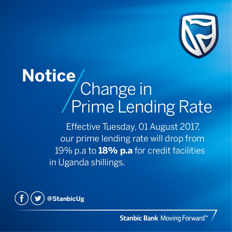 The prime lending rate has been reduced to 18.0% per annum for credit facilities in UGX with effect from 1st August 2017.