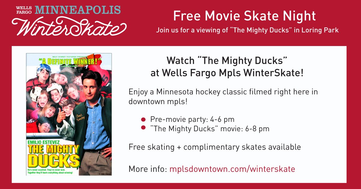 @WellsFargo#MplsWinterSkate coming up Friday, Jan. 17 in Loring Park! Enjoy a pre-party from 4-6 pm + movie showing at 6 pm. Free skating & complimentary skates available!#mplsdowntown#mymplsdt https://www.mplsdowntown.com/watch-the-mighty-ducks-at-wells-fargo-mpls-winterskate-on-friday-january-17/ … pic.twitter.com/75qRmPRFuk
