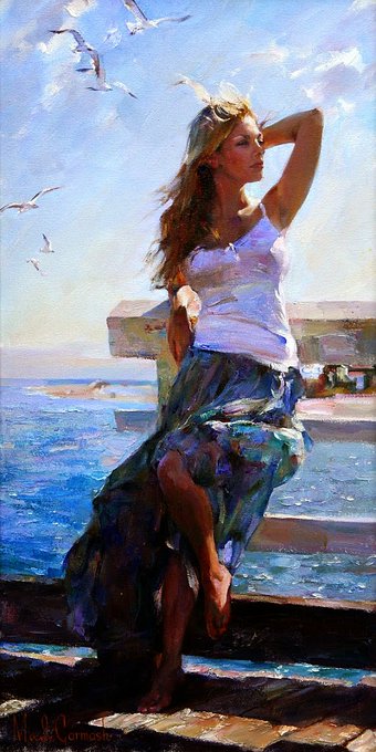 La tarde vuelve a pintar Una musa despeinada Descalza, desenfadada Con sol y espuma de mar Su risa puede intentar Hacer volver al viajero Y con un beso sincero Dejarlo preso después De un abrazo q tal vez Los convierta en aguacero