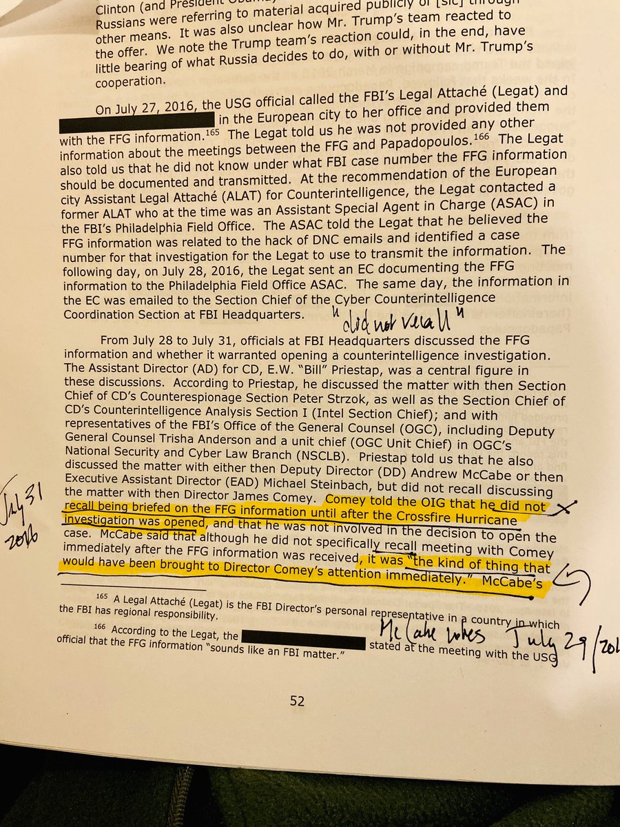 #FISA More conflicting testimony. Former Dir Comey told IG Horowitz he “did not recall” being briefed on George P intel until after case opened July 31, 2016 p52. McCabe “contemporaneous notes” suggest otherwise p53.#Durham#MyHighlighter pic.twitter.com/1EBTpkSO36