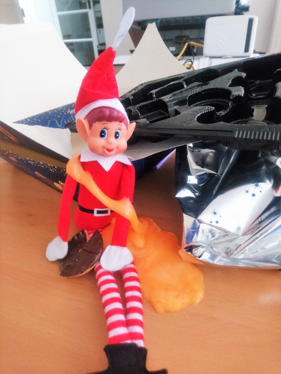 We thought this Naughty Elf would have left on Christmas Day, but we have come back into the office to find he has eaten all our Christmas biscuits and then thrown up! We're not sure why he looks so happy about it!