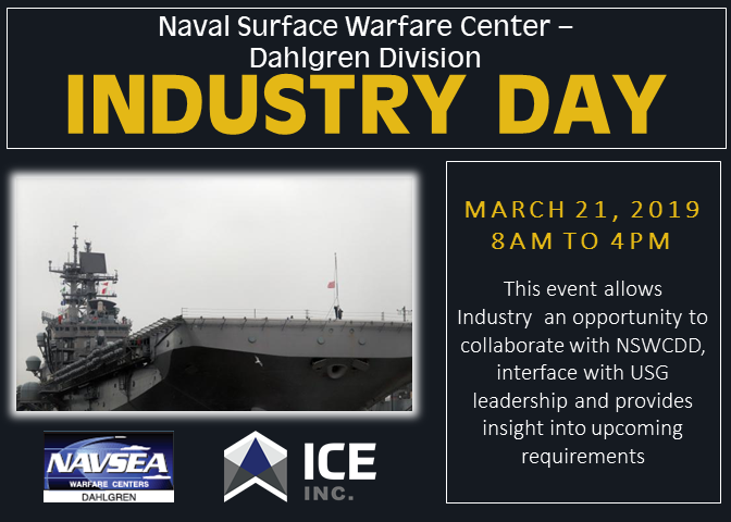 ICE Inc. is attending the Naval Surface Warfare Center – Dahlgren Division Industry Day! This event, hosted by Senior Government Representatives, allows industry the opportunity to interface with NSWCDD leadership and first hand insight into upcoming requirements.