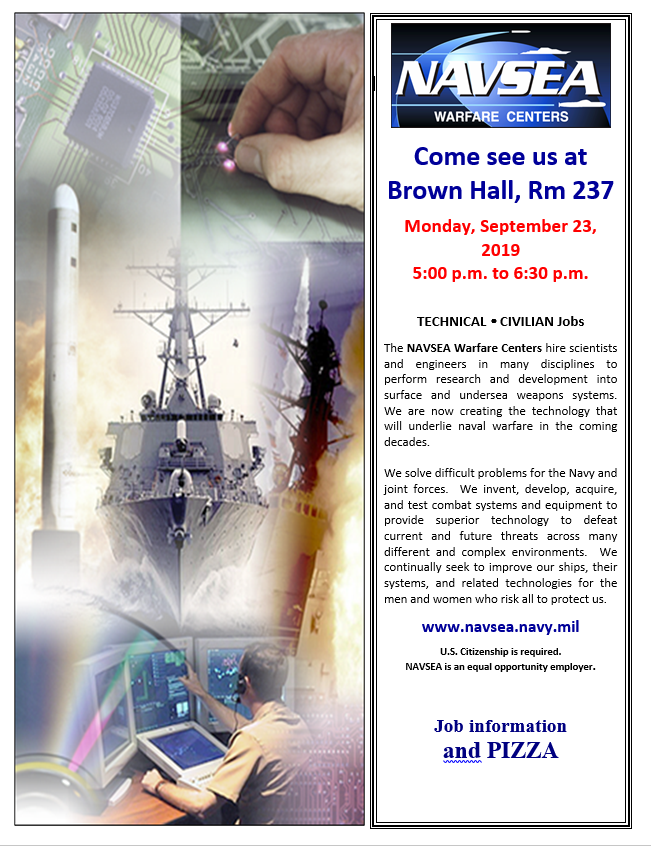 The NAVAL SURFACE WARFARE CENTER Dahlgren Division will be at the STEM Career Fair on September 24th and will also be on campus on the 23rd to host an information session. See them at Brown Hall 237 from 5-6:30pm to learn more!