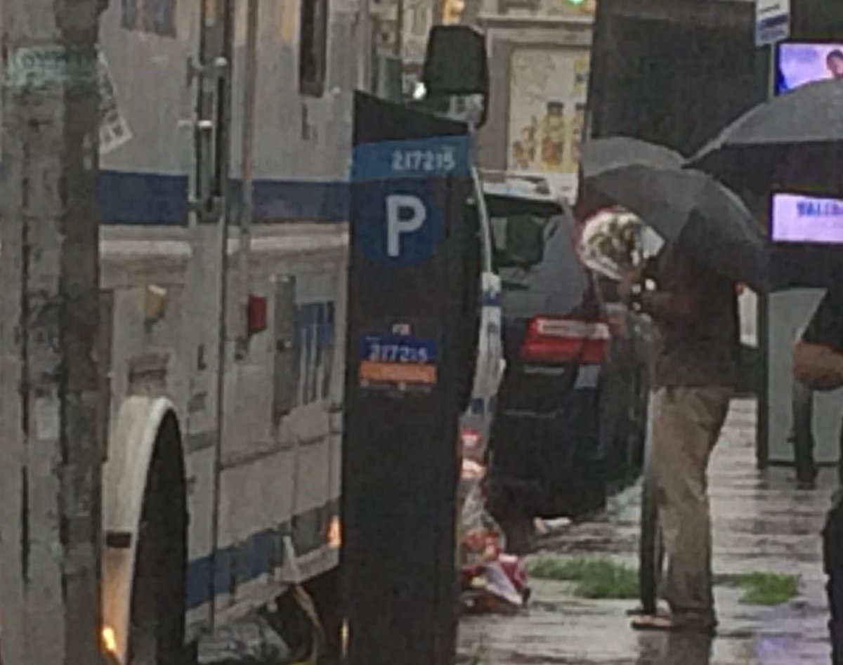 Even in the pouring rain, a man stops to pay respects at the memorial for Ofc Miosotis Familia. Her funeral mass is Tuesday at 10a