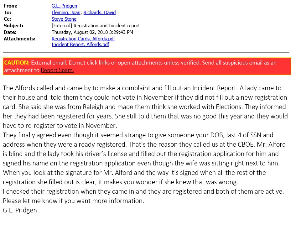 #NC09 election fraud investigation. These emails show Robeson Co. BOE officials contacted@NCSBE in Aug '18 after voters complained a lady came to their house claiming they had re-register to vote & she signed a blind voter's application.@wsoctvpic.twitter.com/plpZGyVHqD