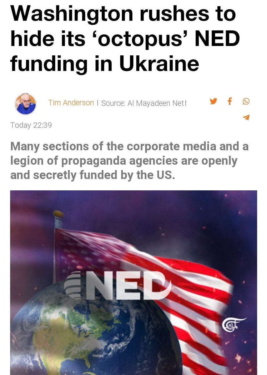 #Russia invaded#Ukraine#Washington rushed to delete funding details of 100s of#Ukraine groups through its ‘National Endowment for Democracy’#NED , finance used in attempts to subvert and control most of the world. https://english.almayadeen.net/articles/analysis/washington-rushes-to-hide-its-octopus-ned-funding-in-ukraine …pic.twitter.com/AVVEw3SBKT