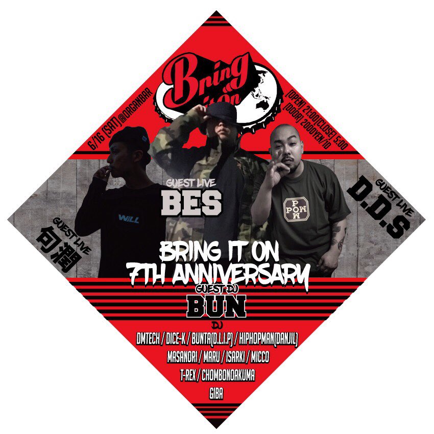 【INFO】 6/16(sat) 渋谷organ barにて開催される "BRING IT ON 7TH ANNIVERSARY" にD.D.Sが出演!! GUESTにBES、句潤、DJ BUNを始め、レギュラー陣もHIPHOPMAN、DJ BUNTA(D.L.I.P)等、周年にふさわしいメンツとなっております。 是非お見逃しなく!!