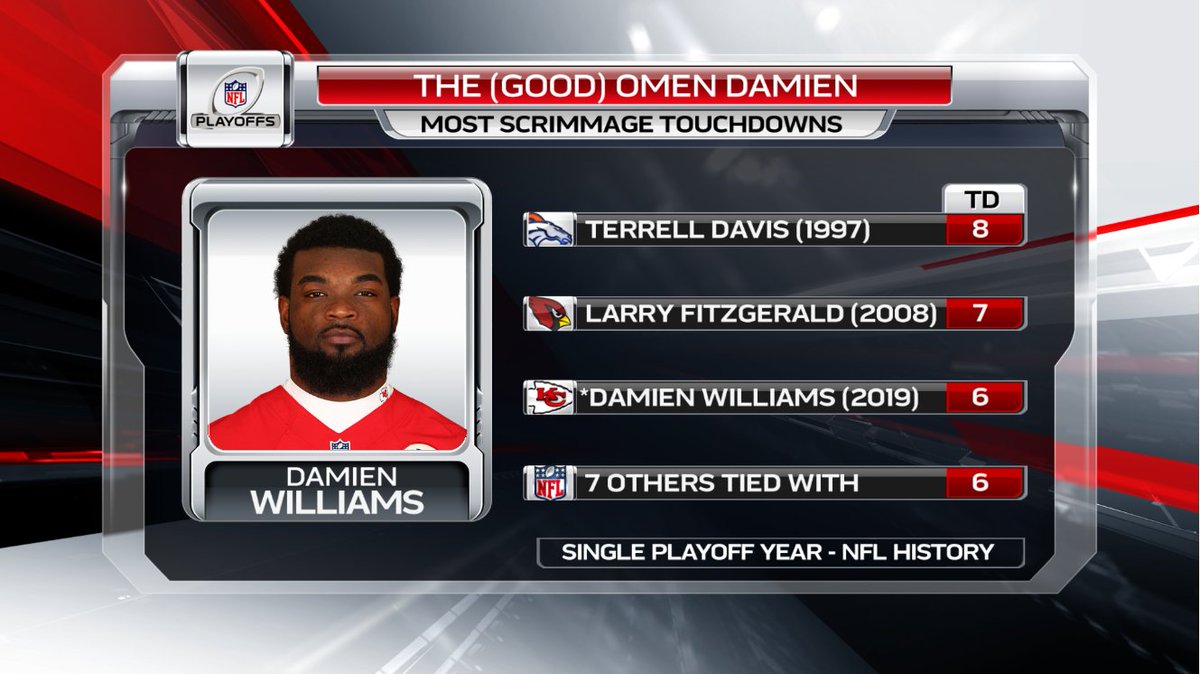 #SuperBowlLIV vs the 49ers tonight, Damien Williams wraps up his 2019#NFLPlayoffs tied for 3rd here thanks to recording 6 (of a superb 11 career) TD from scrimmage pic.twitter.com/x0EZrNg82I