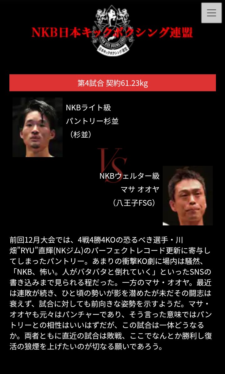 3日後、2/8(土)NKB後楽園ホールで行われる全カードの解説コメントが遂にアップ!ジャパンシフトランド杯59kgトーナメントは準決勝2試合、メインはPRIMA GOLD杯ミドル級トーナメントの決勝戦!ミドル級TOP8の頂点に立つ選手はNKBミドル級1位・田村か?WPMF元王者清水か?!http://nkb-r.com
